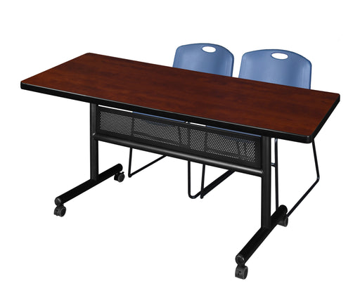 RegencyFeatures Versatile table and chair set includes a 48-inch Kobe mobile table with locking casters and two Blue "M" Stack Chairs Tabletop is constr...