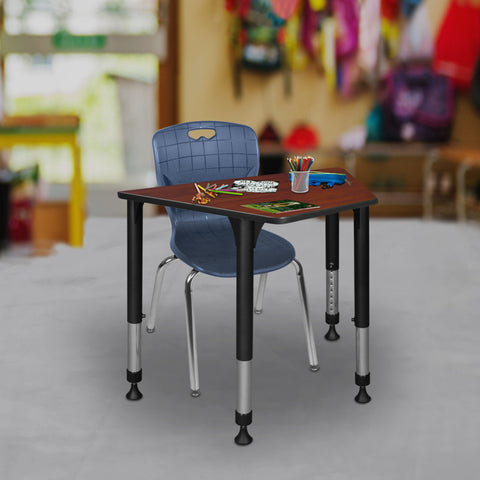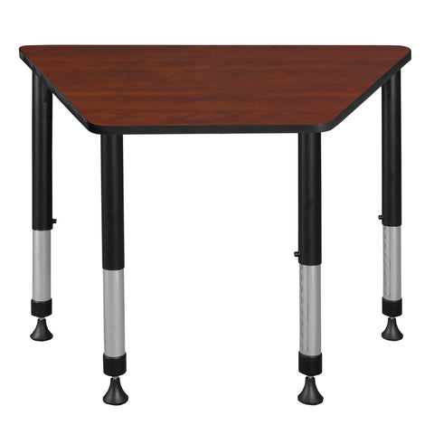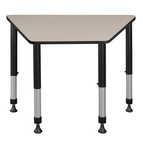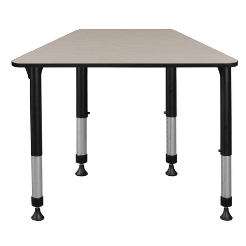 This Trapezoid Height Adjustable School Desk is ideal for rooms with students of all ages. Kee adjustable post legs come four to a set and are height adjustable to accommodate students of all ages. Height is easy for adults to adjust by loosening and tightening a bolt with the included hex key. This 36-inch by 23-inch student desk assembles in a snap with just a few screws. The desktop is constructed of a thermal fused melamine Beige laminate tabletop that is 3/4-inch thick and finished with a black T-mould edge band. Laminates are scratch, stain and scald resistant and wipe clean easily. Rounded corners make the table safer for everyone. A sleek alternative to pedestal style bases, the adjustable post legs come in a classic black with chrome underneath. Adjustable glides on the bottom of the base ensure a level desktop and are easy to adjust.