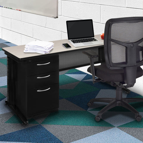 Fusion Desks bring a modern yet functional edge to any office or classroom. This 48-inch Single Pedestal Desk is good looking and has amazing interior wire management capabilities. Black metal C-Legs have a vented compartment with removable cover that runs the length of the leg. Wires run from a power source on the floor through the legs and cabling cutouts in the modesty panel and up to desktops for instant connectivity. It includes one Box-Box-File Pedestal that can be installed on either side of the desk. The file drawer accepts both letter and legal filing while the box drawers keep supplies handy. All drawers lock and have silver colored curved drawer pulls. The desktop is constructed of a thermal fused melamine Beige laminate that is 1-inch thick and finished with a black Bumper Edge edge band. Rounded corners make the desk safer for everyone. Laminates are scratch, stain and scald resistant and wipe clean easily. The legs and modesty panel are constructed of a sturdy metal with a stylish black finish to match any decor. Fusion casegoods are backed by a 10-year limited manufacturer's warranty.