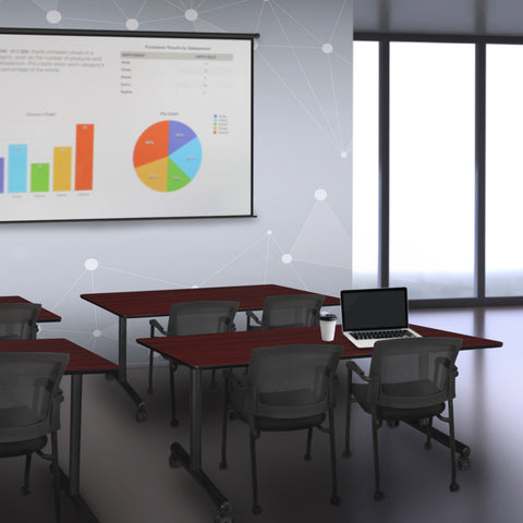 The elegant Kobe collection puts the class in classroom. These versatile tables are at home in stylish restaurant settings as well as classrooms, breakrooms and more. This set includes one 48-inch long training table and two Mesh Knight Guest Chairs. The table is constructed of a thermal fused melamine laminate tabletop that is 1-inch thick and finished with a black T-Mold edge band. This tabletop is double-sided, simply pick the side you like and install the base on the other. Self tapping wood screws and a placement template are included. Laminates are scratch, stain and scald resistant and wipe clean easily. The base is constructed of a black tubular steel T-Base and is protected with a black powder coated finish for a uniform, matte finish. Locking casters provide a mobile option, making any Kobe table suitable for computer labs, training rooms, classrooms and more. Regency’s Knight breathable mesh backside chair gives you a luxury design at an affordable price. The side chair provides an ergonomic back giving you support as you lean back while the breathable fabric back keeps everyone cool. Its comfortable padded armrests curve down giving your arms a smooth rest. And the super padded seat cushion has just the right amount of firmness to ensure a comfortable sit for long hours. A reinforced black metal frame is designed to support up to 400lbs and a built in handle makes moving the chair easier. The stackable side chair easily stacks up to 4 chairs at a time. And is multipurpose for offices, waiting rooms or training rooms. Its versatile angular design complements any setting, and it comes with casters and glides for mobile or stationary use in Black seat upholstery and back mesh. All Regency chairs are backed by a 5-year limited manufacturer's warranty on chair bases and frames and a 2-year limited manufacturer's warranty on chair mechanisms and upholstery. Kobe tables are backed by a 10-Year Limited Manufacturer's Warranty.