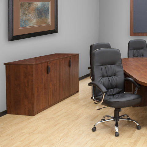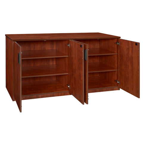 The Legacy Storage Collection offers it all from combo files and bookcases to stackable storage and laterals. This Storage Buffet looks great in conference rooms, executive offices, lounges and cafes, resource libraries and more. At 36-inches high, it can also double as an extra work or storage surface. It has four doors that pivot on European style hinges that open to a spacious interior. There are four adjustable shelves that can be moved in 1-inch increments. Adjustable glides on the bottom of the base keep shelves level and are easy to adjust. Finished in an attractive Cherry laminate, storage components coordinate with other Legacy furniture which makes customizing easy. The Legacy collection is constructed of a 1-inch thick thermal fused melamine laminate with a 3-millimeter commercial grade matching PVC edge. Laminates are scratch, stain and scald resistant. Legacy casegoods are backed by a 10-year limited manufacturer's warranty.