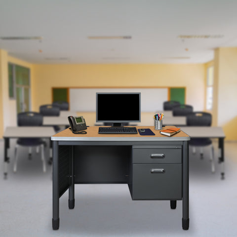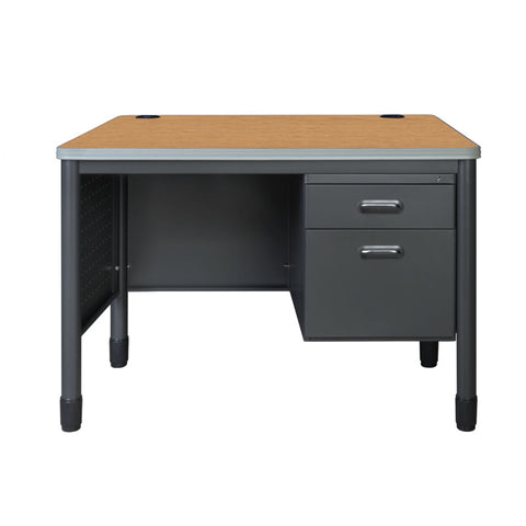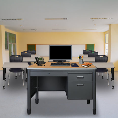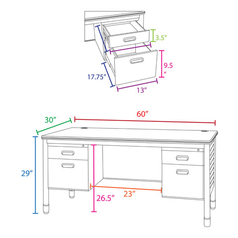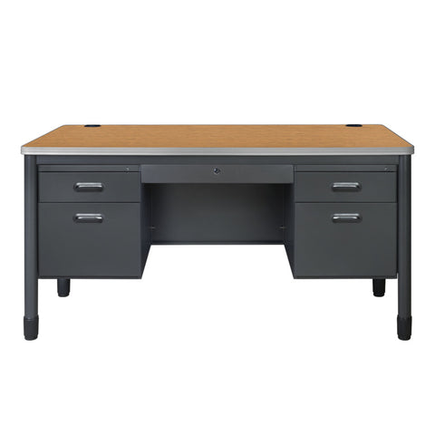 Elevate your professional workspace with the Mesa Series double-pedestal desk from Romig, where durability meets sophisticated design. This executive-style desk features a generous 30" x 60" work surface, providing ample room for all your business essentials while maintaining a sleek profile. Thoughtfully engineered with two integrated cable management grommets, this desk keeps your workspace clean and organized by eliminating cord clutter. The practical five-drawer design is perfect for protecting sensitive documents and valuable equipment. Built to last, the desk stands on robust round steel legs with adjustable leveling glides, ensuring stability on any surface. The premium 9mm Bumper Edge edge banding protects your investment by guarding against daily wear and tear. Standing at an optimal 29" height and engineered for easy assembly, this desk meets or exceeds industry standards for safety and durability, making it an ideal choice for classrooms, executive offices, or any professional setting where quality and functionality are paramount.