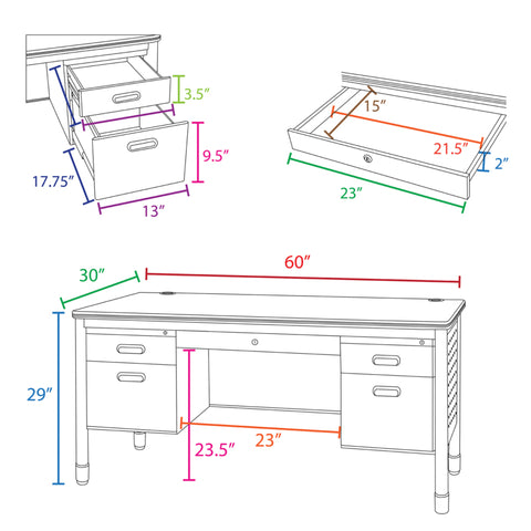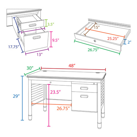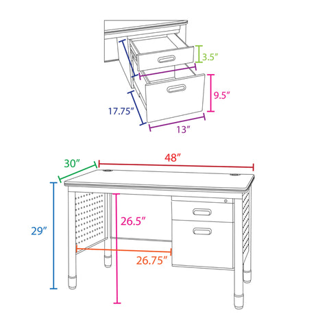 - One locking file drawer accepts both letter and legal filing while box drawer keeps supplies handy. The pedestal can be installed on either side of the desk during assembly.